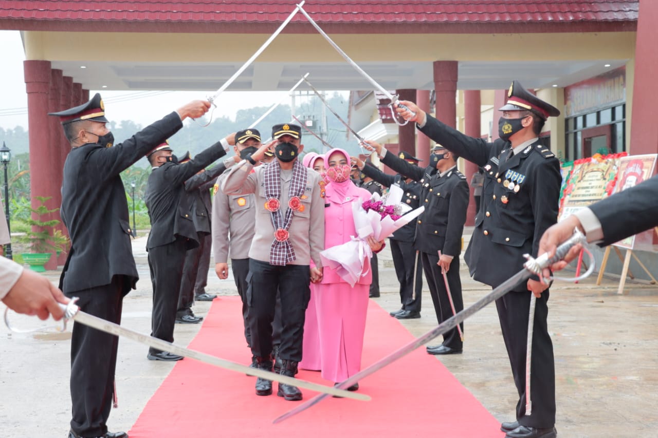 Kemudian dilanjutkan dengan upacara penyambutan yang ditandai dengan pengalungan bunga Kapolres Mamuju Tengah kepada pejabat baru dan pelepasan pejabat lama dengan gerbang pora.
