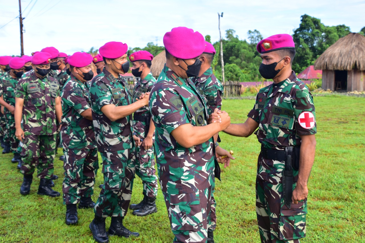 SORONG PAPUA BARAT | Setelah kurang lebih 10 bulan menjaga pulau terluar Indonesia dalam hal ini Pulau Brass dan Pulau Fanildo, prajurit Pasmar 3 yang tergabung dalam Satuan Tugas Marinir Pengamanan Pulau Terluar (Satgasmar Pam Puter) XXV TA. 2021 dibawah pimpinan Letda Mar Bayu Prasetyo kembali ke home base. Kedatangan personel Satgasmar Pam Puter tersebut disambut dengan tradisi upacara penerimaan oleh Komandan Pasmar 3 Brigjen TNI (Mar) Y. Rudy Sulistyanto, S.E. Selasa (28/06/2022).