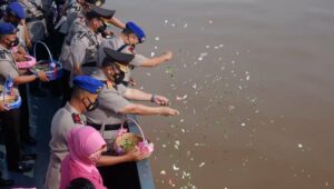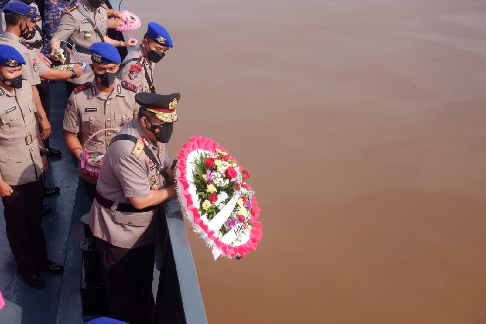 PONTIANAK KALBAR |Menjelang Perayaan Hari Bhayangkara Ke 76, Polda Kalbar menggelar Upacara Tabur Bunga di Muara Jungkat Sungai Kapuas, Rabu (29/06).