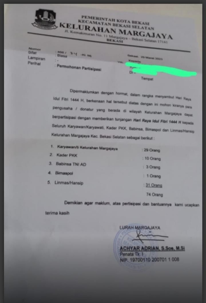 [] Beredar Surat Lurah Margajaya Bekasi Selatan Meminta Partisipasi THR Ke Pengusaha? Baca selengkapnya disini 👉 https://www.matapersindonesia.com/beredar-surat-lurah-margajaya-bekasi-selatan-meminta-partisipasi-thr-ke-pengusaha/
