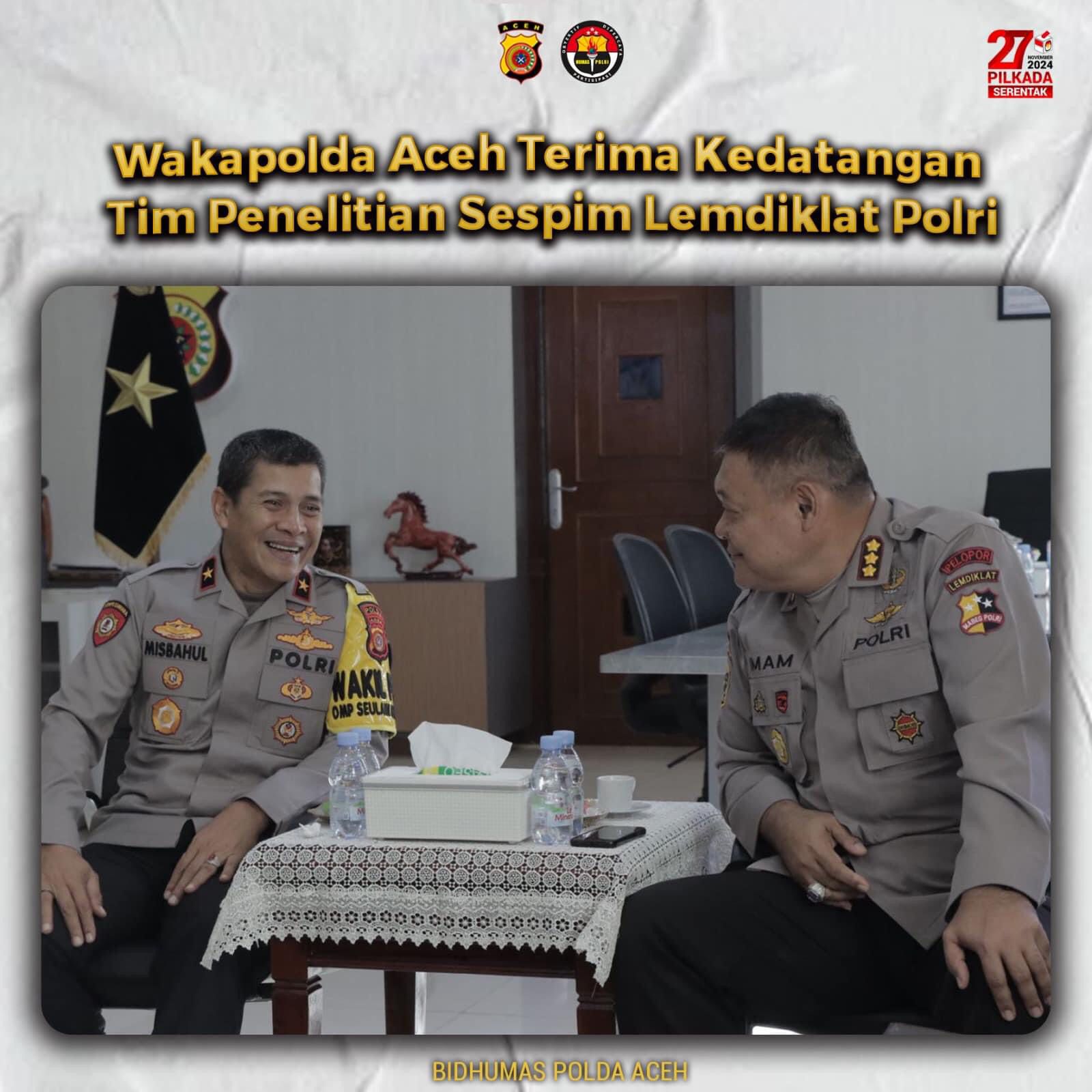 INFOINDONESIAINEWS.COM| ACEH – Wakapolda Aceh Brigjen Pol Drs Misbahul Munauwar SH menerima kedatangan tim Penelitian dari Sekolah Staf dan Pimpinan (Sespim) Lemdiklat Polri di ruang kerjanya, Senin, 7 Oktober 2024.