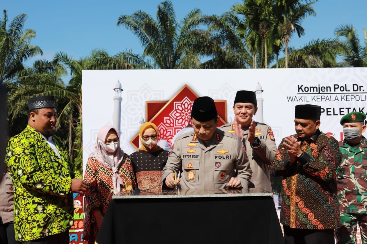 PEKANBARU | Wakapolri Komjen Gatot Edy Pramono melakukan peletakan batu pertama pertanda dimulainya pembangunan masjid Al Kastoeri di jalan Sejahtera Keurahan Agrowisata Rumbai Barat Pekanbaru pada Selasa (27/6/2022).