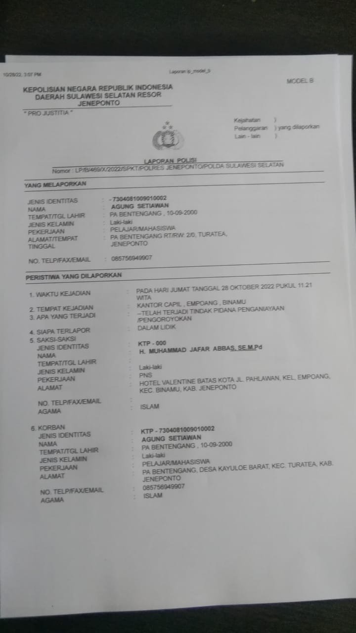 ” Padahal sayakan hanya konfirmasi kebenaran nya tapi kadis langsung marah-marah, padahal saya baru pertamakali masuk di Kantor Dinas Kependudukan dan pencatatan Sipil Jeneponto untuk melakukan wawancara. Saya bahkan sempat diusir karena melihat gelagat tak baik, saya memutuskan untuk keluar dari kantor Capil akan tetapi pada saat saya sudah berada di halaman kantor Disdukcapil tiba-tiba ada beberapa oknum PNS mendatangi saya, tanpa banyak bicara langsung mengeroyok, bahkan diantara mereka ada yang bertanya battu kemaeko parasanganmu (dari mana asalmu_red) sambil melayang kan tinju kemuka saya, “. ujar Agung yang merupakan wartawan Mata Publik.