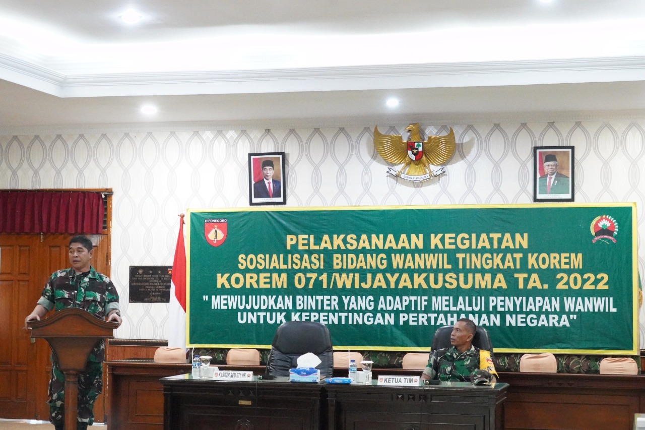 Komandan Korem 071/Wijayakusuma Kolonel Inf Yudha Airlangga, S.E., dalam amanat tertulisnya yang dibacakan Kepala Staf Korem 071/Wijayakusuma Letkol Inf Candra, S.E., M.I.Pol., mengatakan sosialisasi bidang Wanwil ini bertujuan untuk mentransformasi kekuatan pertahanan negara yang siap digunakan untuk kepentingan pertahanan negara.