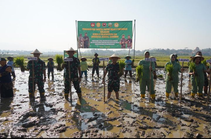 Danrem 071/Wijayakusuma Kolonel Infanteri Jamaliddin, S.I.P, turun langsung dalam prosesi penanaman padi tersebut bersama-sama dengan Dekan Faperta Unsoed Prof.Dr.Ir. Sakhidin, M.P., Kapustaka dan Literasi Pertanian Kementan RI Muchlis, S.E., M.Si, Dandim 0701/Banyumas Letkol Inf Arm Ida Bagus Adi Purnana, S.T., M.Han., Kadistan Kab. Banyumas yang diwakili Kordinator BPP Kec. Kemranjen Ibu Ratih, Ketua Persit KCK Koorcab Rem 071 PD IV/Diponegoro Ny. Dali Jamaluddin, Forkopincam dan UPT Pertanian Kemranjen serta Kades Karangjati.