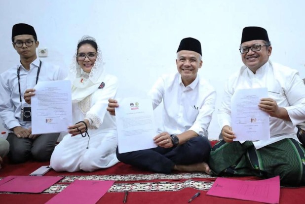 Ditemani istrinya Siti Atiqoh dan putranya Alam Ganjar, Ganjar menandatangani piagam tersebut saat mengunjungi Pondok Pesantren Nurul Huda Setu, Bekasi, Jawa Barat pada Kamis (14/12/2023).